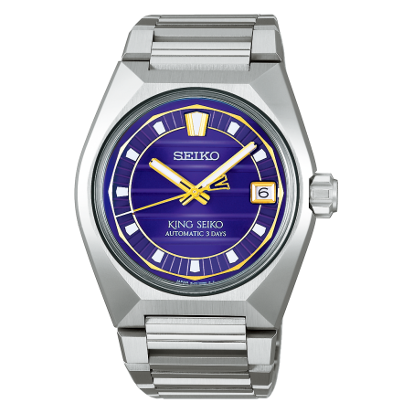 La King Seiko VANAC SLA083 est une montre automatique 8L45, 41 mm, design anguleux inspiré des années 70, cadran texturé violet, saphir, fond transparent, étanche 100 m.